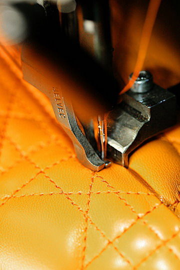 约需要四名工匠:一人裁剪、一人组装、一人缝纫、一人装饰。在发货前,使用一块柔软的布轻轻地用特殊产品给皮包打蜡。最后一道工序更是为突显小羊皮的天然光泽.