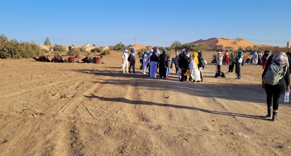 沙漠三日游的第二天下午,我们的旅游中巴到了西撒哈拉沙漠脚下梅尔祖卡小镇的骆驼出发驿站。下车前,驾驶吩咐大家只带当晚在沙漠帐篷中过夜的衣物及洗漱用品,其余行包都放在车上。骆驼骑行,驼队没专门骆驼带行李,所有个人物品都得随身携带。骆驼的负重有限,个人物品太多会伤到骆驼。