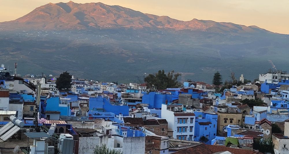 菲斯北边几百公里有一座蓝色的山城叫舍夫萨万Chefchaouen,这几年成了网红城市,所以我们也打算去见识见识。从菲斯到舍夫萨万不通铁路,只能坐公交或跟团前往。无论哪种方式,单程都得三四小时。如果跟团的一日游,在小城只有三小时左右的停留时间。我们觉得太赶,所以决定在古城住两晚,这样有一整个白天游览。