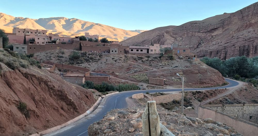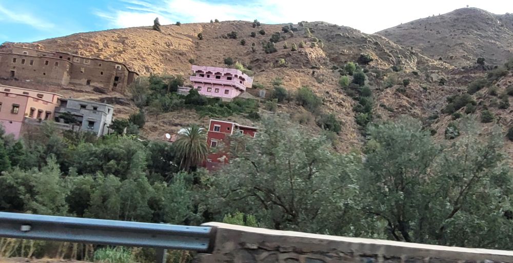 沙漠三日游最后一天早晨骑完骆驼后回到沙山脚下的出发驿站,下一程有的回马拉喀什,还有的像我们前往另一站菲斯。我们这一行17人中只有我们俩,那对温哥华夫妇以及一对匈牙利来的中年夫妇去菲斯,其余11人则原路返回马拉喀什。因为只有我们六人,旅行社在当地雇了一辆七座的越野车,送我们去菲斯。