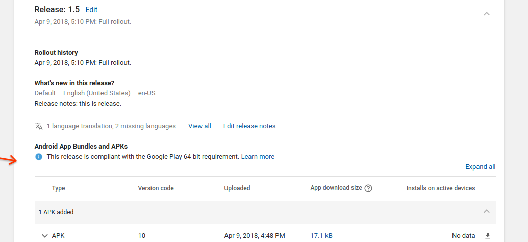 Play Console also shows warnings that apply to your draft releases if there are any issues related to the 64-bit requirement. The following image is an example.