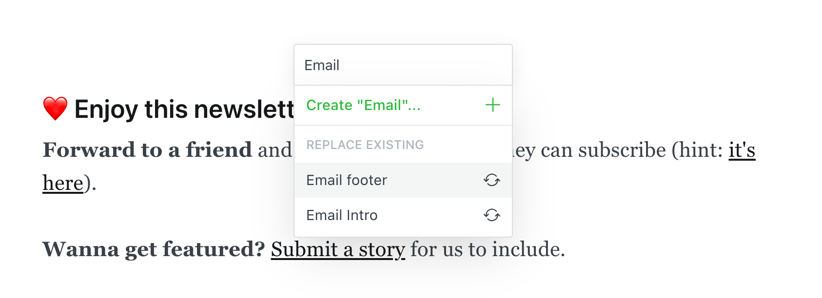 To save a snippet, highlight the content you'd like to transform into a template, then click the snippet icon in the toolbar to save your selection with a name.