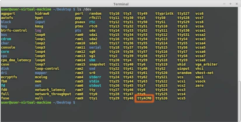 On most Linux distributions, the device will have a name in the form ttyACMx where x will be a number. Running the command ls /dev/ttyACM* should list all attached CDC devices. On MAC OSX, the device should be visible under /dev directory but with a different name. Running ls /dev command print all devices and it should be relatively easy to find the name representing the USB GPIO device. The images below show Linux and Mac OSX examples.