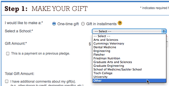 Download the support form in PDF format. Or visit the Tufts advancement site. [As shown below, please select "Other" in the Select a School option and indicate "Perseus" in the "Other" text entry box which appears.]