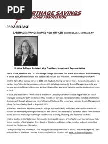 Carthage Savings Names New OfficerPDFCarthage Savings Names New OfficerAdded by Newzjunky0 ratingsfunction fs(e,t){var n=e+t;return n<=0?0:Math.round(e/n*100)}% found this document usefulSave Carthage Savings Names New Officer for later