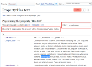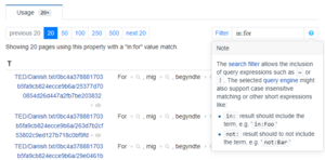 Property pages provide a field that allows for filtering data values annotated to the respective property. The filter restricts the display of applicable pages to the results determined.1. A concise tooltip2 is provided and the "Usage" tab displays the number of all applicable filtered results even if not all of them may be shown on the page.